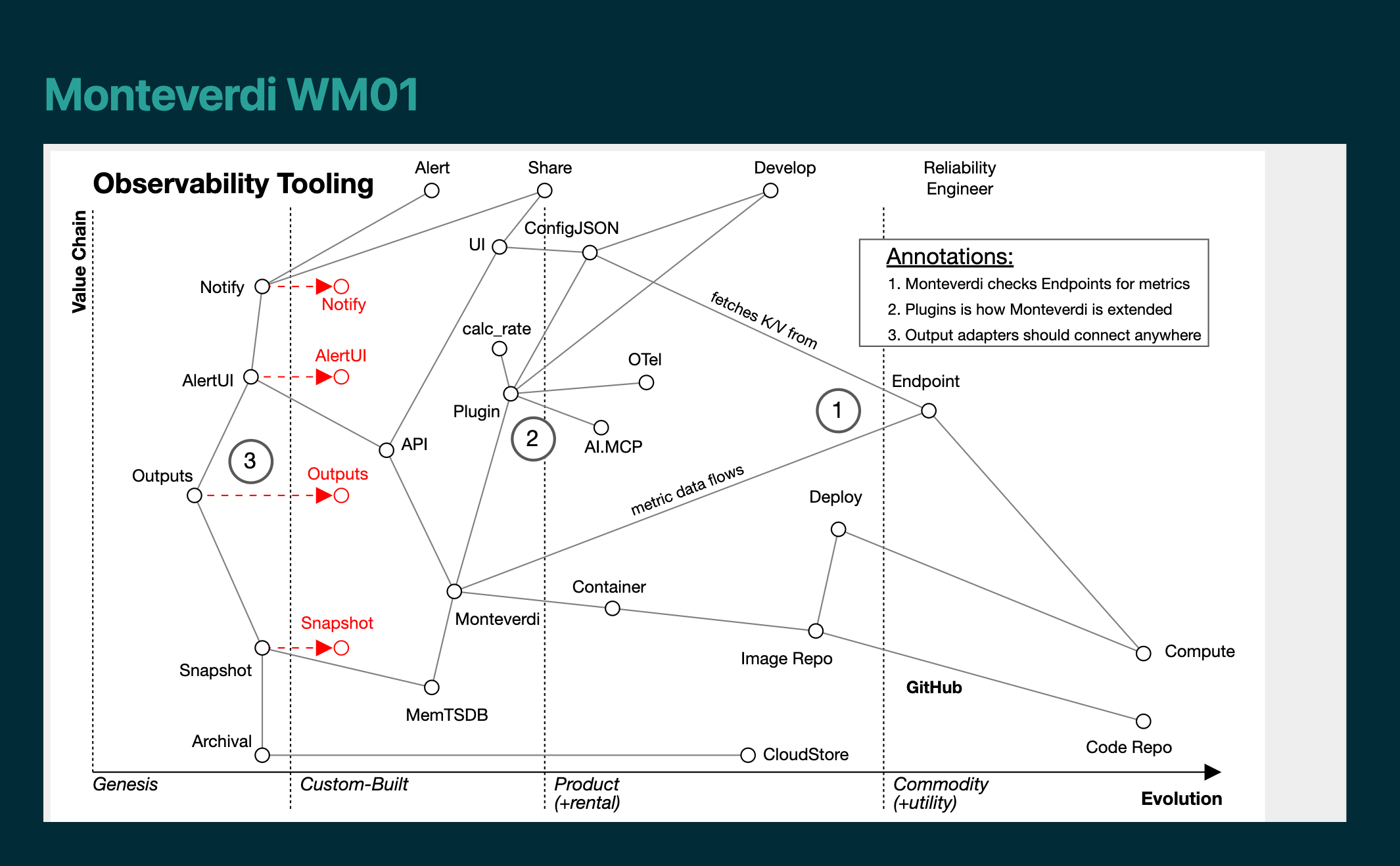 One last Map to share, a very recent one where I’ve been trying out the Wardley Maps as Code plugin for Obsidian. There is no pipeline object so I’m still figuring out how to do Value Streams. The following I made while I was reading the book, it’s the first iteration of a Map about Observability Tooling, the User a Reliability Engineer with Needs: Alert, Share, Develop.