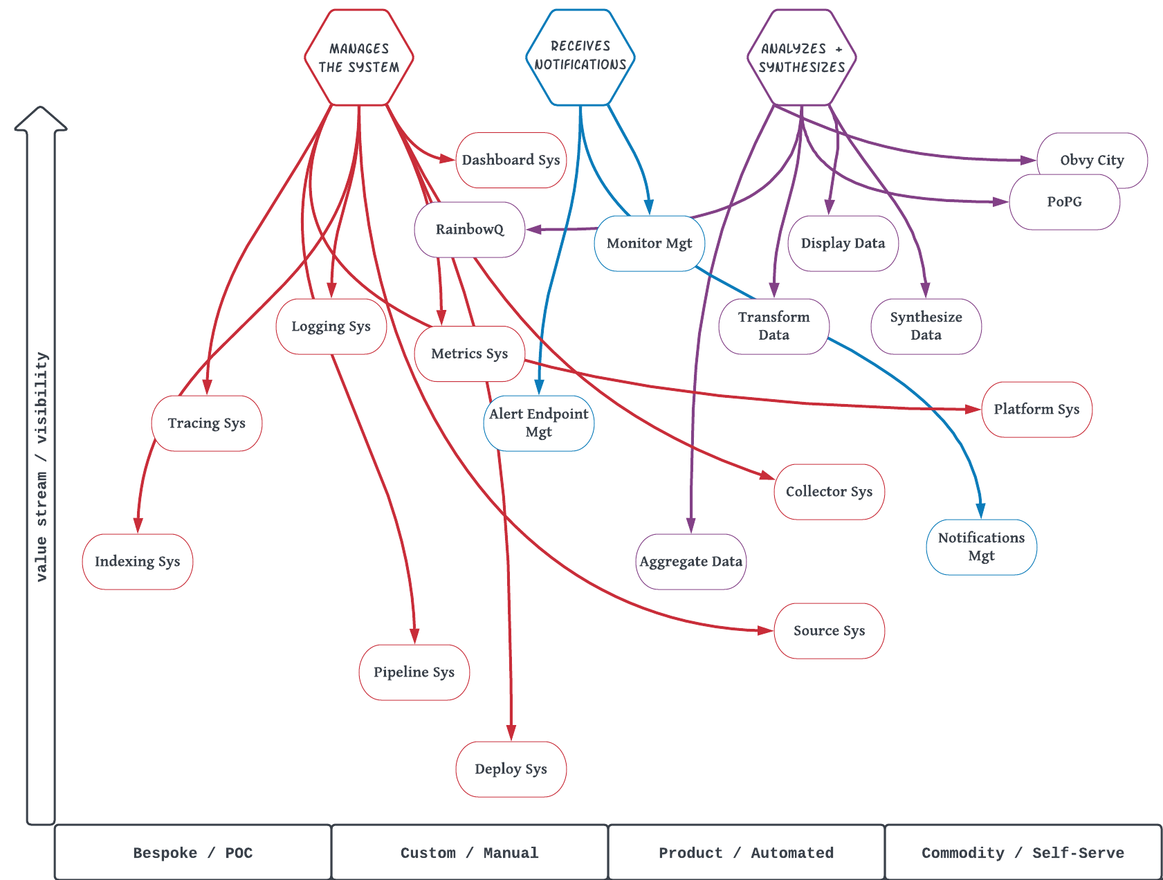 Below, my Problem Space contains the platform providing Observability and other SRE sponsored Reliability Systems, its Users are implied as those who need Observability, with three User Needs: Manages the System, Receives Notifications, Analyzes/Synthesizes.