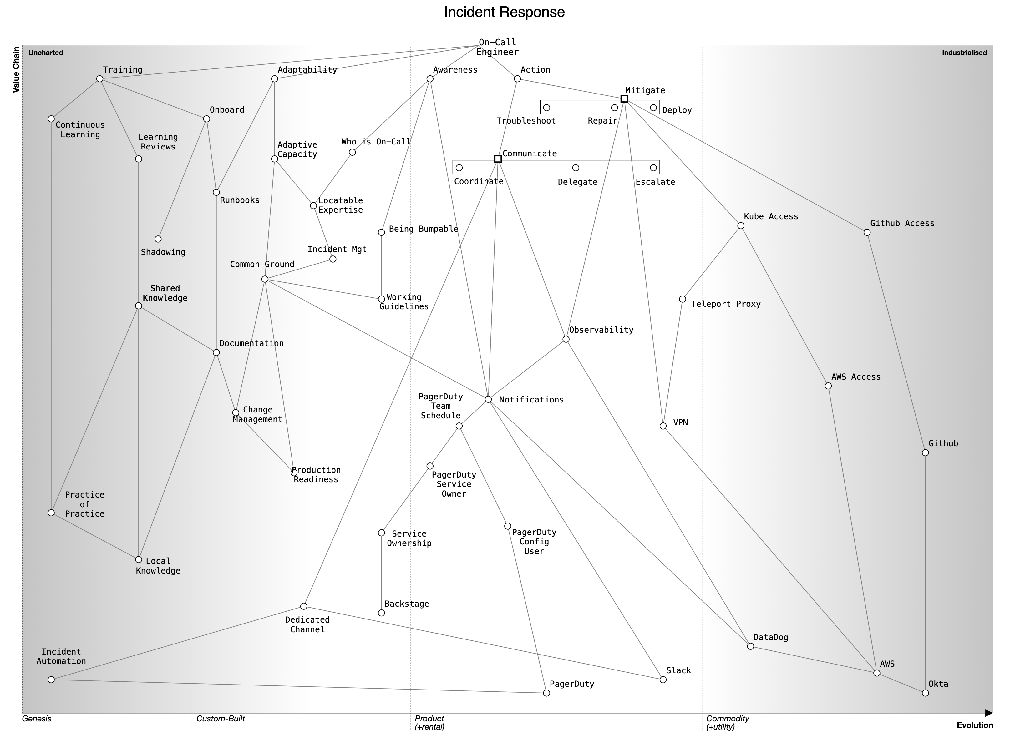 Value Streams can be used to break down dependencies to understand the underlying dynamics of something a team has to do. My second Map below is limited to Incident Response, with four User Needs identified for the On-Call Engineer: Training, Adaptability, Awareness, Action.
